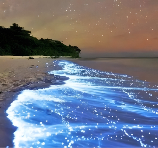While the glowing waves are undoubtedly the star attraction, Vaadhoo Island and the surrounding Maldives offer a wealth of other experiences that make it a bucket-list destination for travelers. The island’s small size and limited development contribute to its charm, offering visitors an authentic taste of Maldivian island life. Days can be spent exploring the lush tropical vegetation that covers much of the island’s interior, relaxing on secluded beaches, or engaging in water activities such as snorkeling and diving in the surrounding coral reefs. The waters around Vaadhoo are home to an incredible diversity of marine life, including colorful tropical fish, sea turtles, and even the occasional dolphin or whale shark. For those seeking a more immersive cultural experience, the island offers opportunities to interact with local Maldivians, learn about traditional crafts and customs, and sample delicious Maldivian cuisine. As night falls and the possibility of witnessing the bioluminescent waves draws near, the atmosphere on the island becomes charged with anticipation. Visitors gather on the beach, their excitement palpable as they wait for darkness to descend fully. When the conditions are right, and the waves begin to glow, the collective gasp of wonder from onlookers is a testament to the profound impact of this natural spectacle. It’s a moment that reminds us of the magic and mystery that still exists in our world, inspiring a sense of awe and reverence for the natural wonders that surround us.