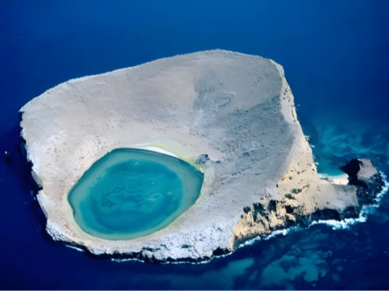 The Blue Lagoon Galapagos Island is sometimes compared to a brilliant blue eye. Does it appear to be one? It resembles an egg with a blue yolk more exactly.