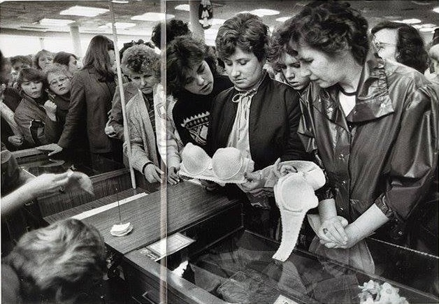 Women buy bras, USSR, 1980s.
