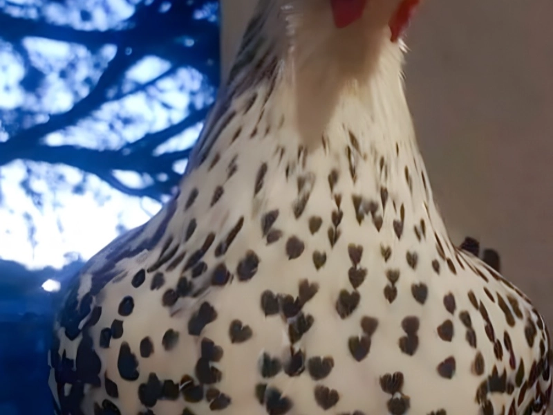 Rare in farmed chicken, this hen’s plumage shows a distinctive pattern of heart-shaped dots that creates a dramatic visual impact. These few bird species have an interesting parallel since the pattern resembles the marks of the spot-bellied owl from India. The hen’s evident attentiveness in the picture, maybe resulting from the indicated presence of an owl, gives the picture a fascinating layer: a bird dressed with symbolic of love demonstrating natural defensive behaviour. This contrast of survival instinct with decorative pattern reminds us of the dual nature of animal markings: beautiful to human viewers but frequently quite important for survival.
