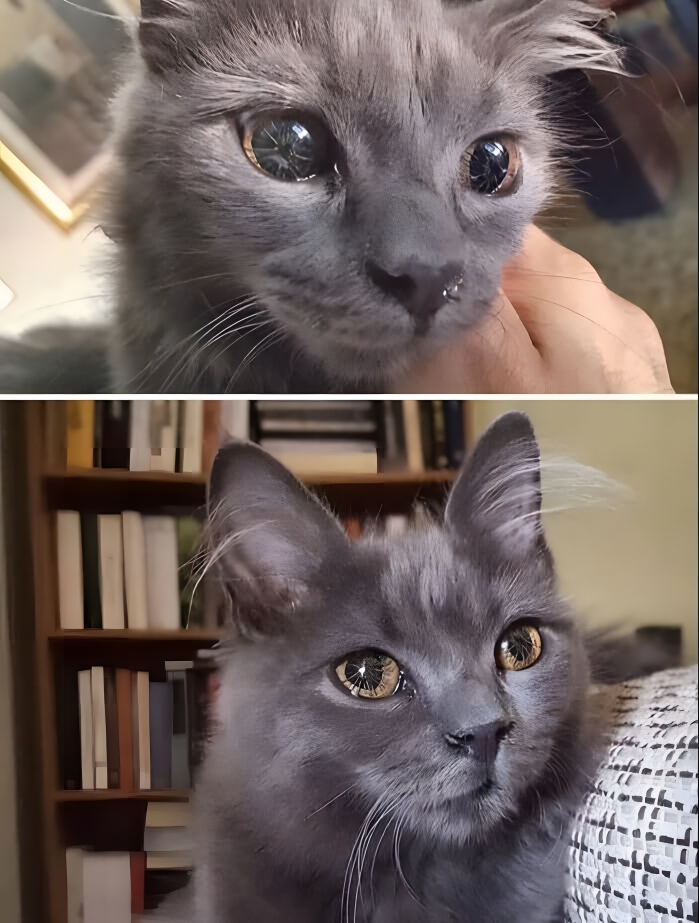 Now Frankie is thriving. A full-grown cat with a loving family. Her eyes are healed and her four ears are merely a genetic difference that doesn’t affect her life. Way to go Frankie!