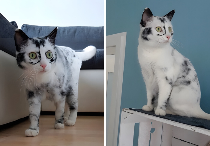 Is it a ferocious white tiger or is it just a marble print cat? Much to your surprise, it is indeed a cat. In fact, this little kitty is named Eli. Eli is a tuxedo cat with Vitiligo which equals a gift of mother nature! She used to be an all-black cat and with the passage of time has become mostly white. Although Eli’s condition causes her fur to look like it’s made of marble stone but just fluffy. She could blend right into a kitchen.
