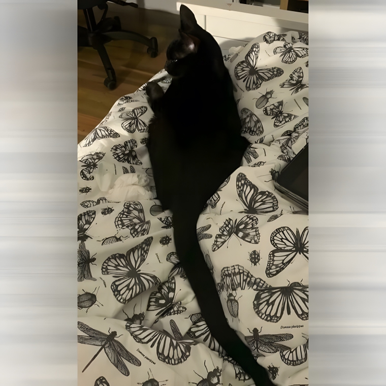 When she was born she was a fully black cat. As the years have gone by, she started to develop these small white spots all over her fur! Her owner took her to the vet and found out she has a rare skin condition. This special kitty has the genetic condition Vitiligo! She is expected to be a fully white cat by the time she is an old cat. Although she looks like the midnight sky, it won’t be that way forever.