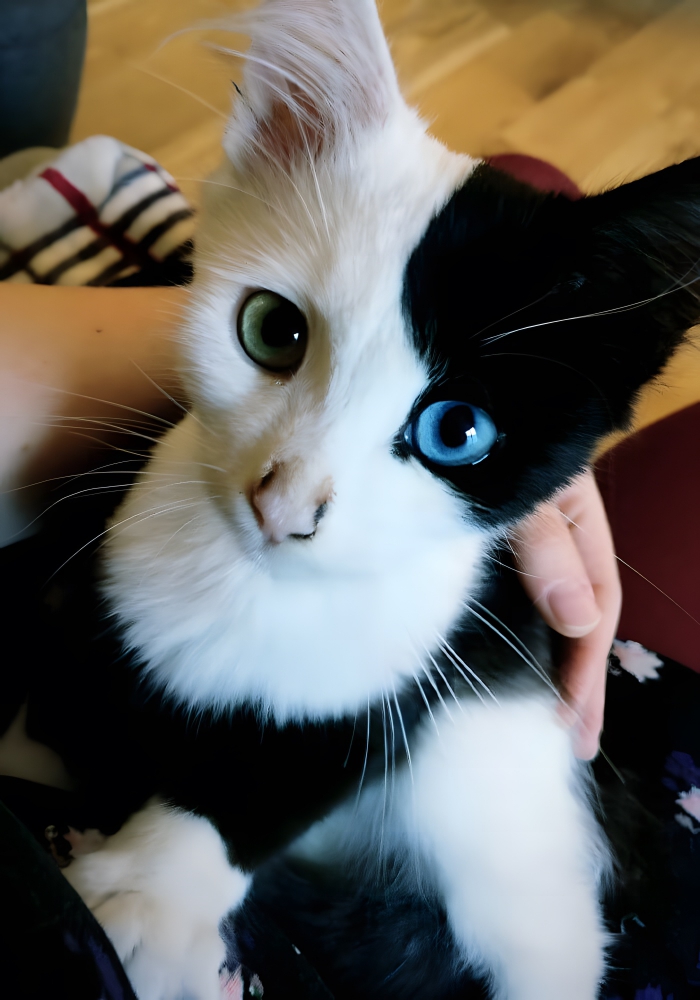 This is Pixel, a beautiful little kitten. Another case of Heterochromia showcasing itself in gorgeous and mysterious ways. Believe it or not, Heterochromia is actually a very rare genetic anomaly that occurs across the animal kingdom. Along with Pixel’s half black and half white fur; she has one bright ocean blue eye and also one beautiful forest green eye. It’s hard to decide which side of her face is cuter. This cat seriously won the genetic lottery.