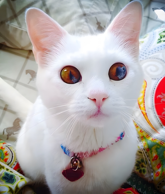 This condition is quite rare in cats. And with the stark contrast of his all-white fur along with his eyes that look like fire and ice; this is one special cat.