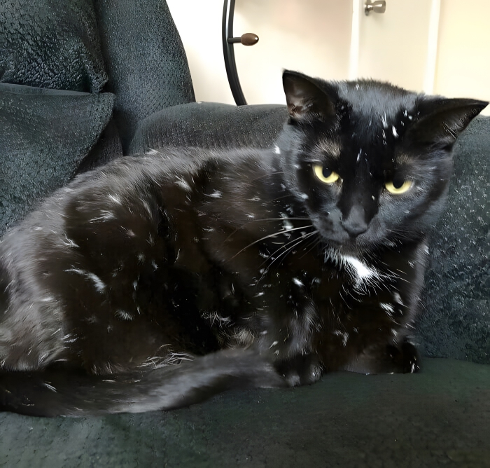 This cat looks like someone flicked white paint all over her! What a star-speckled angel.