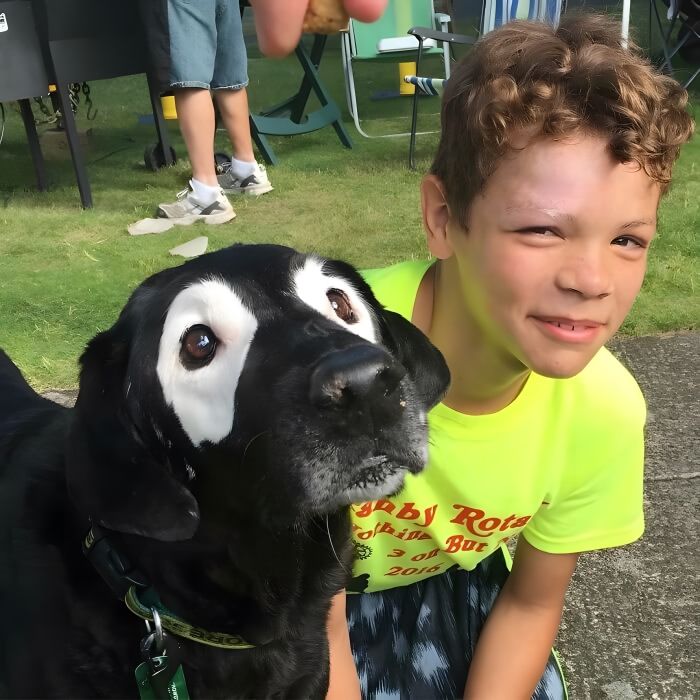 This is Rowdy and Marcus. They have become the best of buds. White-eyed Rowdy is the gorgeous black dog and Marcus is his new human friend. They bonded over their shared genetic condition, Vitiligo. Vitiligo is a rare skin condition that causes depigmentation, usually in white patches all over the hair and skin. And these guys have matching spots on their faces! Rowdy is actually a spokesdog for vitiligo and helped kids with the condition feel more confident in themselves.