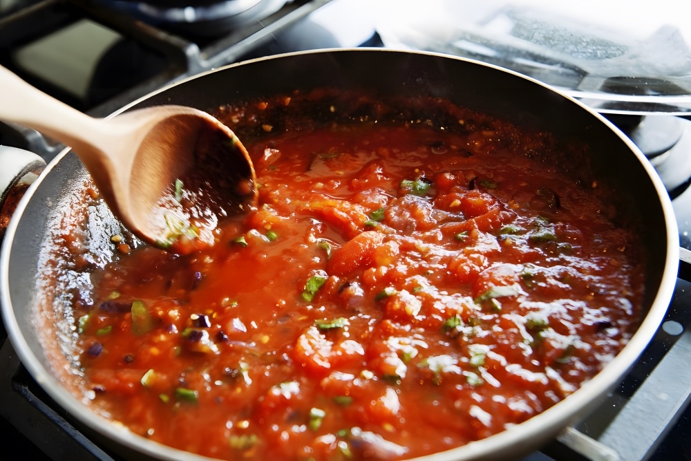 To prepare homemade tomato sauce and use it in place of store-bought tomato sauce, simmer chopped or puréed tomatoes for several hours until they lose their raw flavor, remove the tomato seeds, and strain the cooked tomatoes. How the sauce taste turns out largely depends on the quality of the vegetables used for simmering. For example, sweet tomatoes create a sweet sauce while sour tomatoes make a sour sauce unless the tartness is neutralized with sugar, baking soda, cinnamon, nutmeg, potatoes, carrots, or vegetable broth. Cooks typically add various ingredients to enhance the aroma of tomato sauce, such as salt, onions, garlic, wine, and herbs like oregano, bay leaf, and basil.