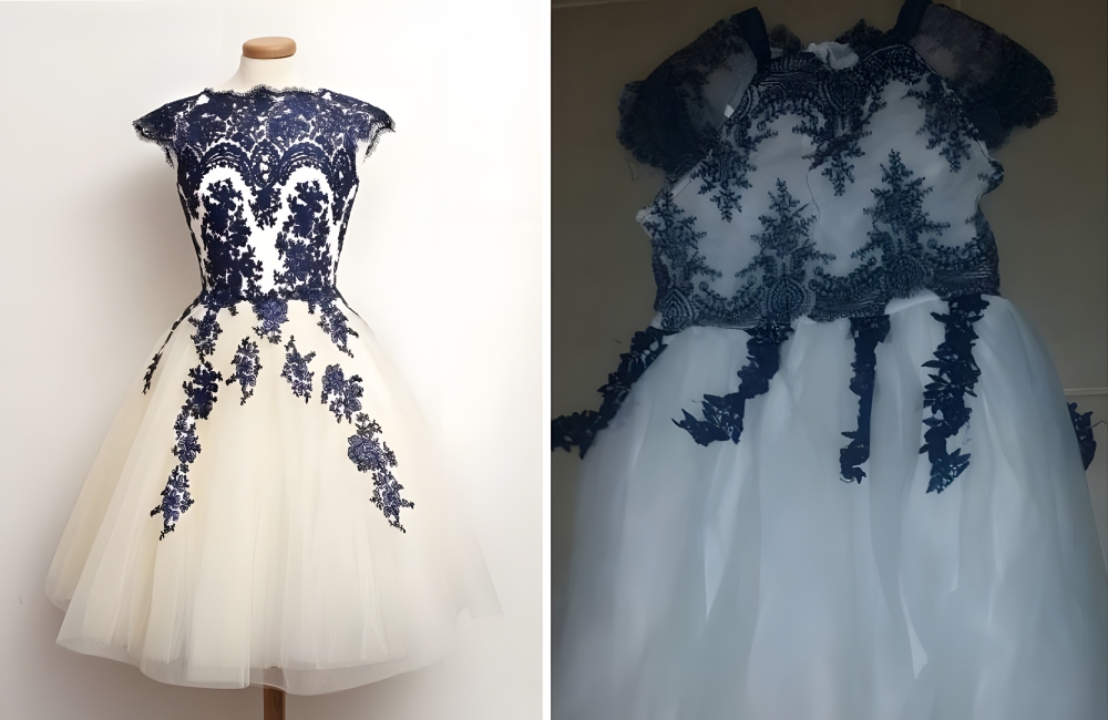 The dress received, much like every single other dress on this list, was a hot mess. Sure, the knockoff site got the colors somewhat right, but the embroidery (if you can call it that) looks like a halfhearted attempt. It’s not even that accurate, and the dress itself looks small enough to fit a child.
