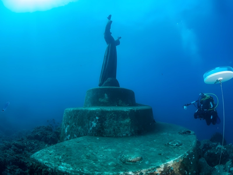 The Portofino Jesus, sometimes referred to as the Christ of the Abyss, was found in the Mediterranean between Camogli and Portofino. Fascinatingly, duplicate casts of this identical monument have been found in museums, churches, and underwater locales all across the world. Sculptor Guido Galletti designed the submerged bronze statue.