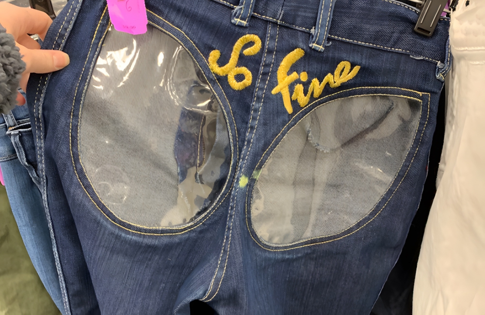 Found at: UnknownValue: $5-$10*If you want to make a fashion statement and possibly get arrested for indecent exposure, these “So Fine” jeans are calling your name. One Redditor found this pair of jeans at their local thrift store, and they have two clear panels where there should be denim.