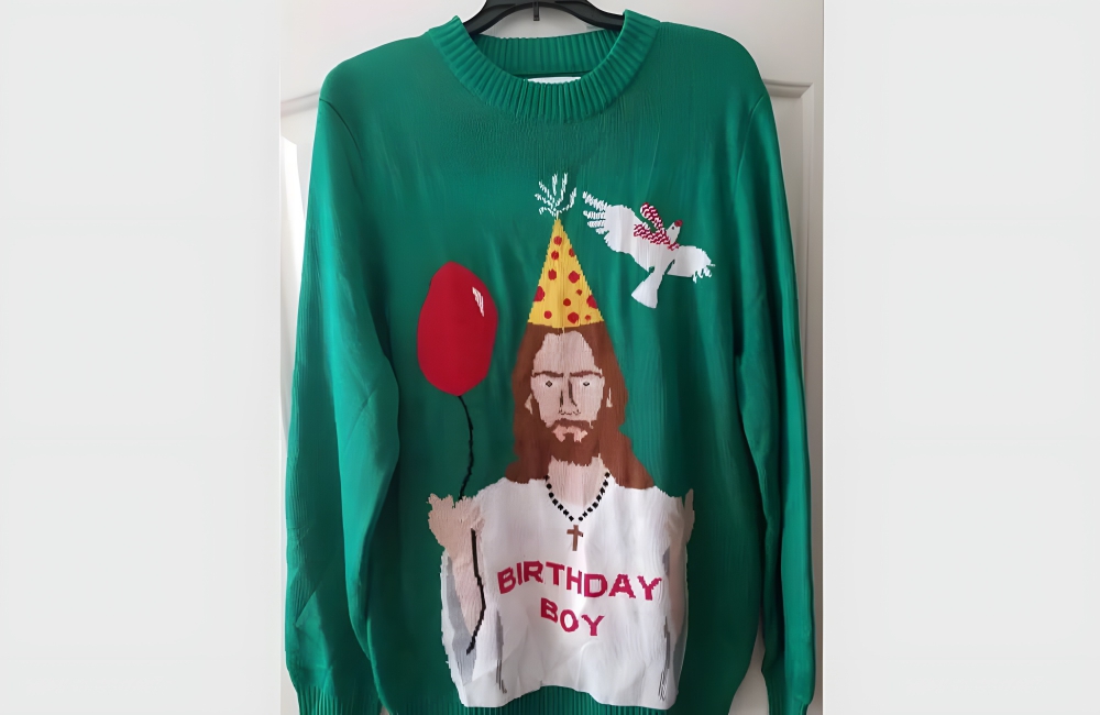 hristmas Themed Sweater @u/Jay_Aggie / RedditOne thrift store shopper found a sweater that had a picture of Jesus with the phrase “birthday boy” on it. The joking reference is serious enough that religious people will like it but funny enough that it won’t come on too strong. Not to mention, the craftsmanship of the sweater itself looks pretty good. Christian or not, it’s a solid find.