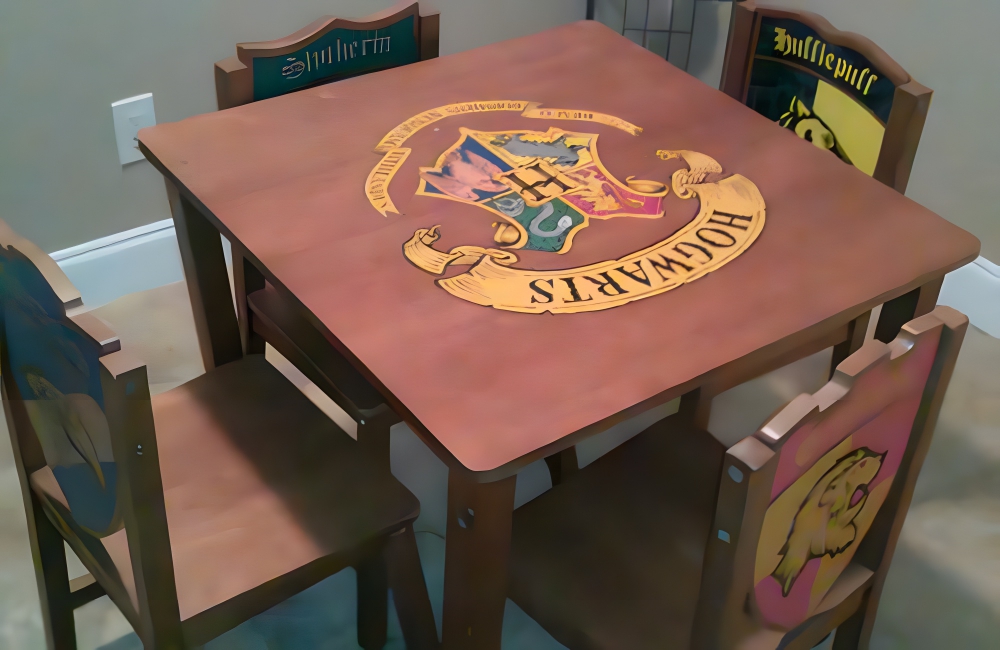 Harry Potter Dining Table /imgur.comThe lucky poster of this picture came across a beautiful Harry Potter-themed dining table in a thrift store, with four chairs representing the four houses of Hogwarts: Gryffindor, Slytherin, Hufflepuff, and Ravenclaw. No matter how great the table is, fights over who gets to sit in which chair are inevitable, at least when it comes to real Potterheads.
