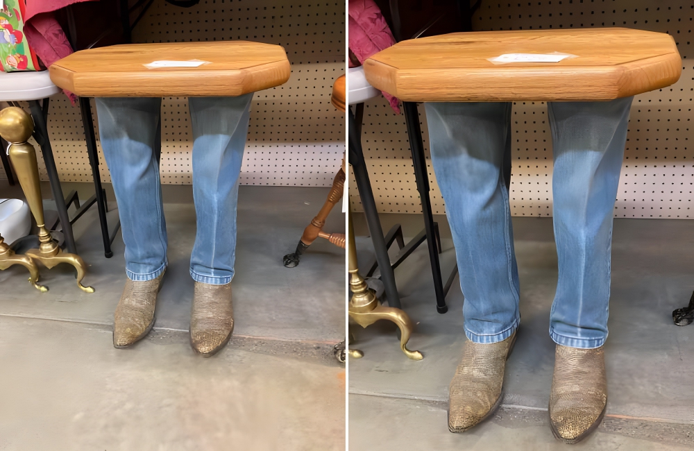The Scare Of A Table r/ThriftStoreHauls/RedditThis two-legged table (pun intended!) is undoubtedly one of its kind, especially for a thrift store find. But it can also give an unsuspecting guest the scare of their life, because after all, what kind of a table stands like that?!