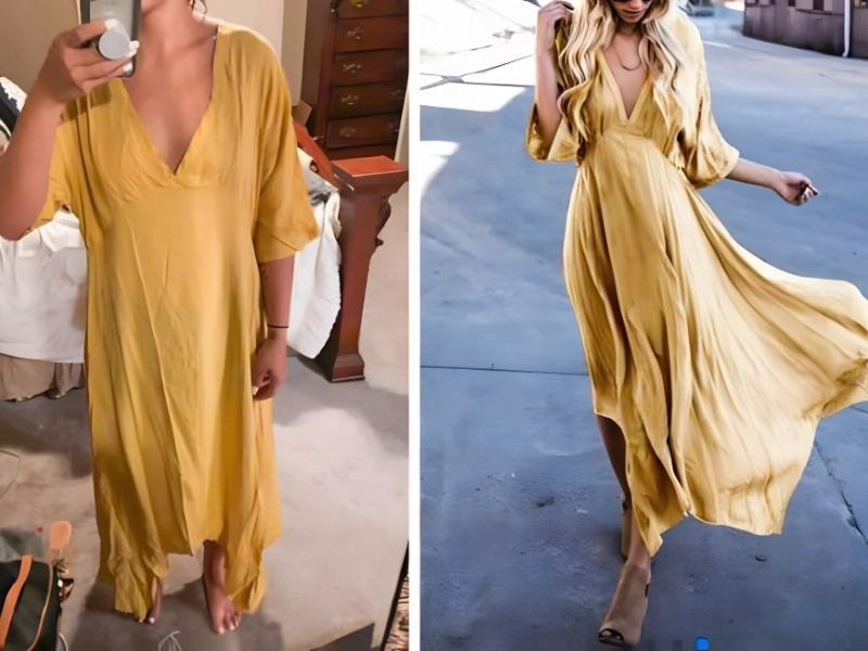 We’ve all been enticed by internet product photographs of models wearing clothing and thought, “Yeah, I could rock that.” That’s the whole aim of advertising: to make things appear so nice that we can imagine ourselves wearing them. One dissatisfied client ordered a yellow linen garment from Novashe and was astonished by what arrived.
