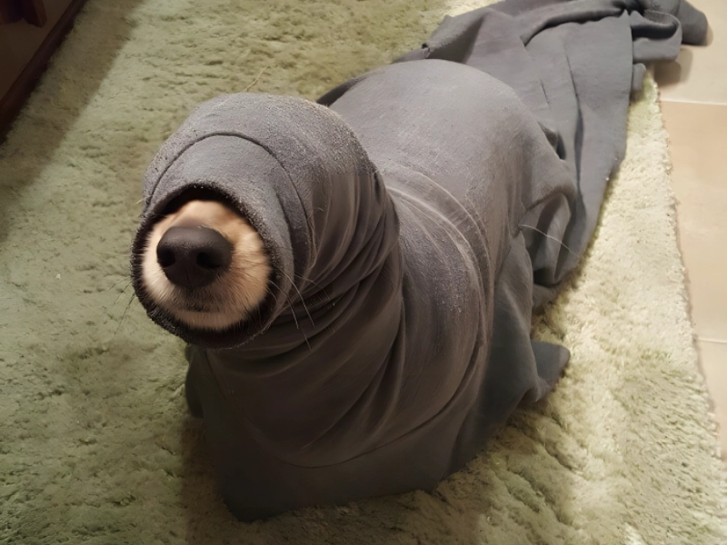 In past life, do we suppose this dog was a seal? Alternatively do you think he’s getting ready to go undercover to experience life as a seal? Who knew?