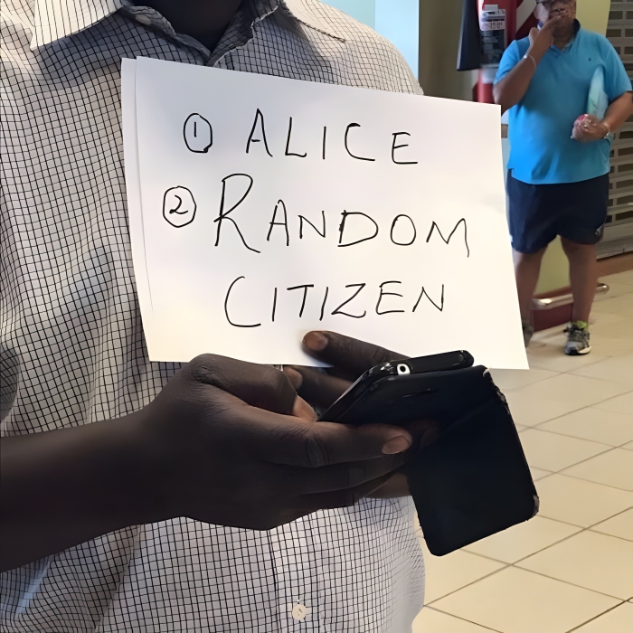 If you make your living as a driver, the number of people you take from place to place is positively correlated to the amount of money that you make. This man was ready to earn an extra buck. On his sign, he has the name Alice – the person he’s supposed to pick up from the airport. Underneath that name, he’s written “random citizen,” inviting a second person to ride along with them. After all, he has to make a living!