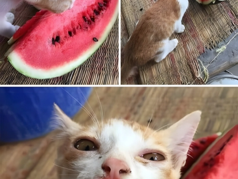 This wonderful collection of pictures presents an interesting riddle regarding a cat and its interaction with watermelon. The way the photographs are arranged creates a fascinating narrative that begs viewers to consider the actual nature of this feline-fruit relationship. The kitty seems to be totally loving its watermelon experience in the first pictures, digging into the fruit with usual feline interest. The story gets more complex in the last photo, though, when we find what seems to be either a moderate allergic response or great excitement. The most remarkable aspect is the kitten’s lips, which have become a vivid red colour that replics flawless lipstick application. This unique hue creates various possibilities: it might be basic messiness from intense eating, a slight allergic reaction, or maybe just the natural staining qualities of watermelon juice. Given that the red colouring appears somewhat bright for simple watermelon staining, its intensity is really remarkable. Fortunately, the kitten seems to be in high spirits and exhibits no signs of major discomfort, implying this watermelon adventure, while remarkable, was finally harmless even if there is a minor allergic reaction.