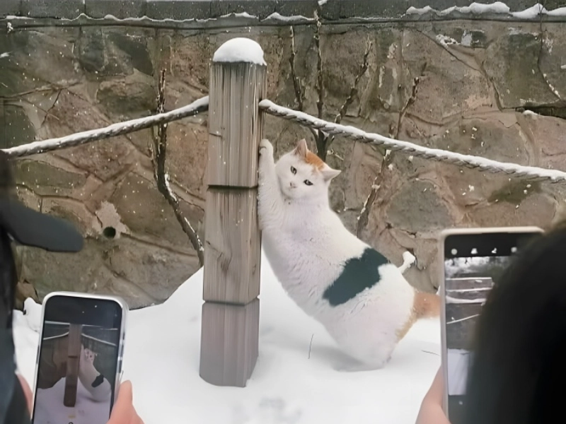 We find in this amazing winter landscape what could only be called nature’s response to social media influencer culture. Surrounded by a perfect snowy scene, the picture shows a particularly gorgeous cat striking what looks to be a purposefully positioned stance against a wooden post. The fact that people are photographing the cat suggests that this feline’s natural modelling skills have not gone unreported, therefore adding even more humour to the scene. Though with an extra layer of natural appeal only a cat could offer, the cat’s posture is startlingly similar to that hit by human models in upscale sports magazines. With a thick, healthy coat that implies it’s well-adapted to the cold surroundings, the feline subject seems suited for its spontaneous photo session. Though its modelling skills might point to a possible career in feline social media celebrity, the cat’s strong appearance and well-kept condition strongly imply that it is a loved pet rather than a stray. While stressing the natural charm that cats seem to have naturally, the whole scenario wonderfully captures the current junction of nature, pet ownership, and our shared need to preserve and share unforgettable events.