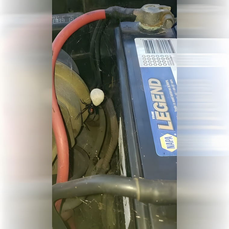 Most people do not love to deal with fixing and maintaining their cars. It is considered more of a hassle than an enjoyable thing. To make matters worse for these people, when they went to go change their car batteries, they were greeted by a surprise friend. There was a massive black widow spider that had made a web in the car hood, attaching itself to the battery of the car.