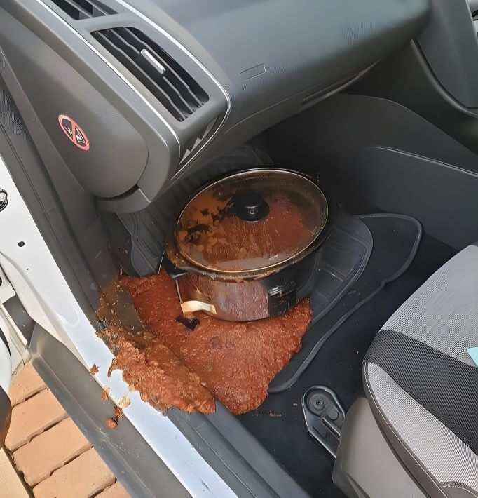 They probably didn’t think that this was the best idea by the time they were done. But how did the chili spill? Were they keeping it at the driver’s feet the whole time?