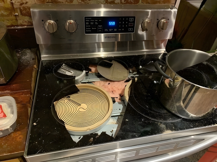 Getting a new oven can be an exciting event in the life of an adult. However, the excitement of that event for this person seemed to be quite short-lived. They purchased a brand-new glass stove, installed it in their house, and were excited to use it for the first time. They left the kitchen for a moment, heard a loud crash, and returned to this horrible and depressing sight.
