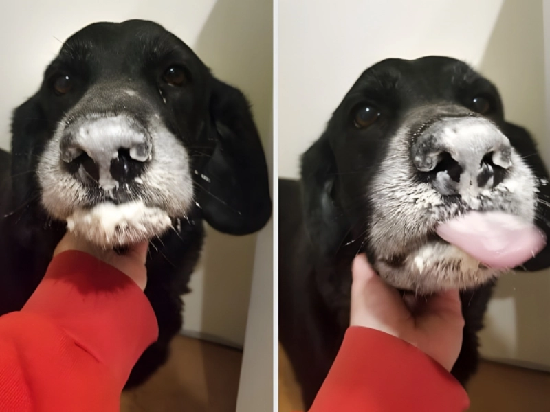 Dogs eating raw flour is obviously quite dangerous and a formula for choking, but it seems as though this dog mom detected the sneak assault at the correct moment.