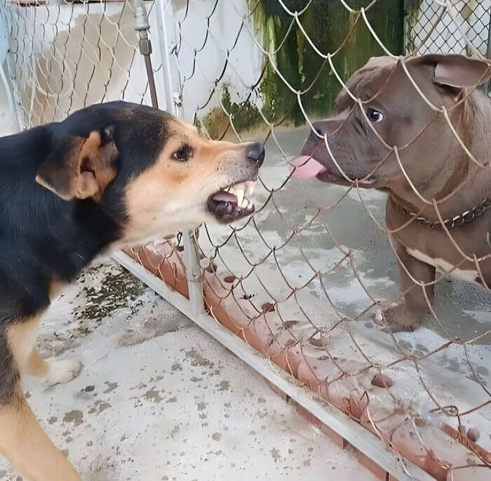 It also looks as though these two are in a shelter or kennel, which means odds are they’re going to be neighbors for at least a couple of days if not longer.