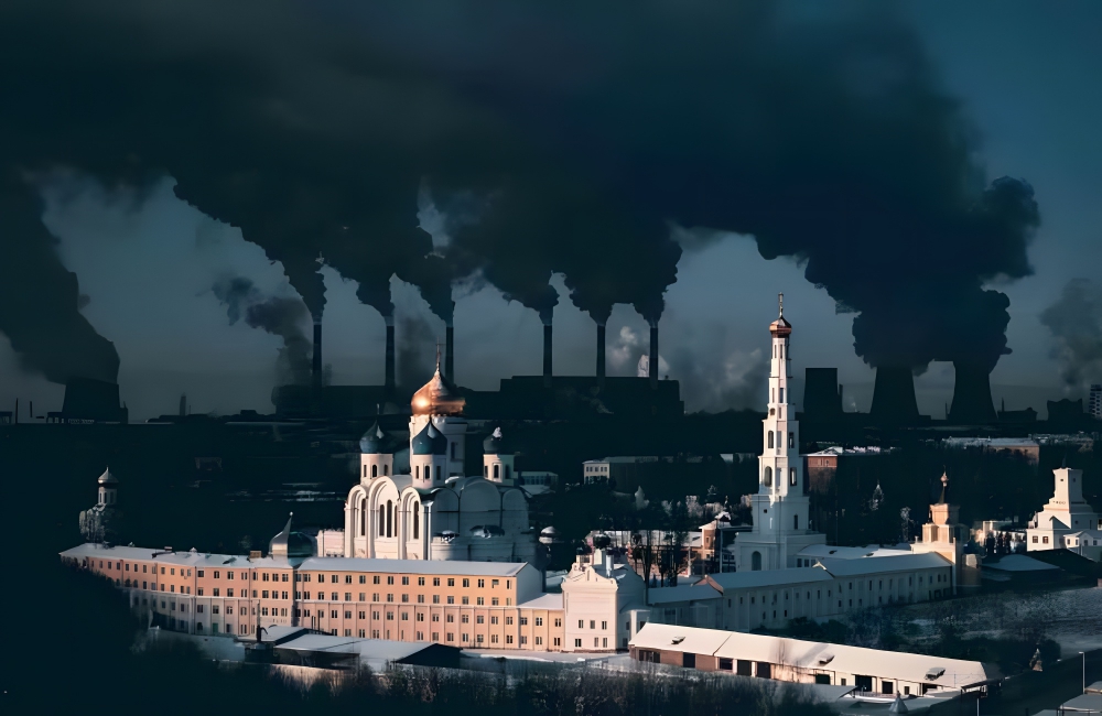This image gives us a beautiful birds eye view of a 500-year-old monastery in Russia’s Moscow until one looks at the disastrous background. One of the city’s most significant power plants foregrounds the image, with the steam flowing out of its cooling towers encapsulating the historical imagery with a particularly opaque fog.