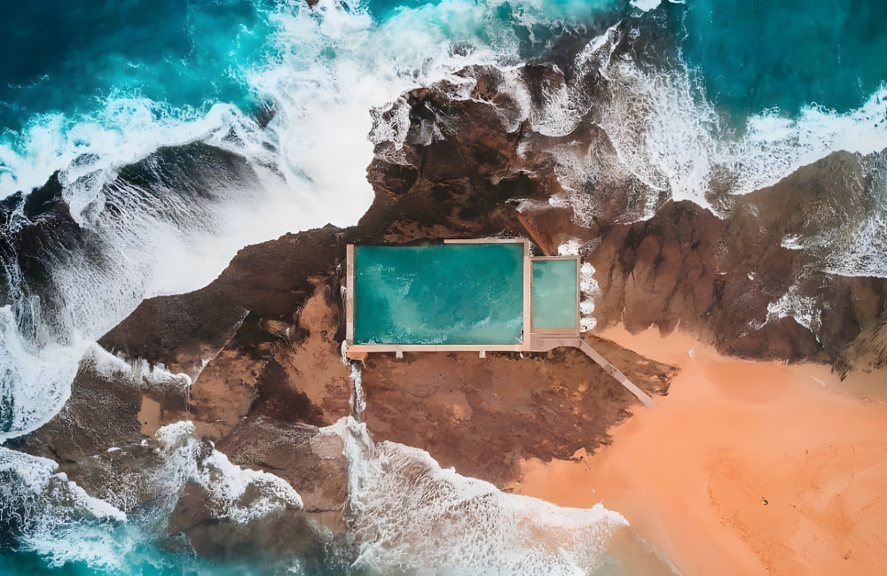 This Ocean Pool in Australia has been encapsulated in a mesmerizing manner in this photograph, presenting a striking contrast between the water and the other elements in the picture. High tides can cause these pools to be surrounded by water entirely, creating an illusion that they might be floating in the middle of the ocean.