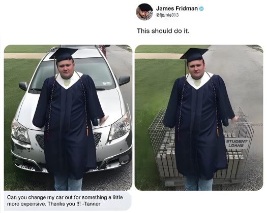 Anyway, his car was swapped out for something much more expensive: all of that debt he probably has from going to college. This one sadly hits close to home, and we feel for this guy.