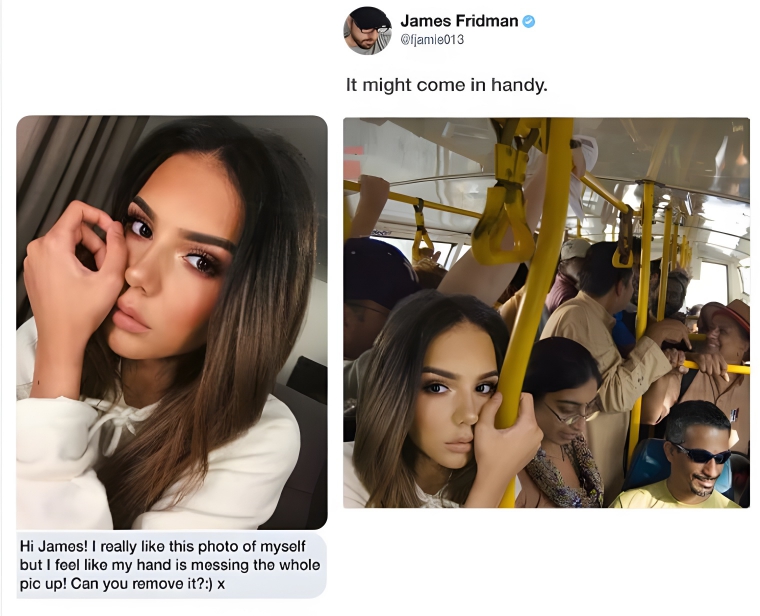 There are a couple of “weird” hand photos on this list, and we’ve never really thought about hands messing up photos before this. However, the girl in the photo on the left did, and she said that she wasn’t happy with the way her hand looked. Instead, she wanted something to be done with it and that’s exactly what she got. She was put on a crowded bus and her hand looks more at home in the second photo.