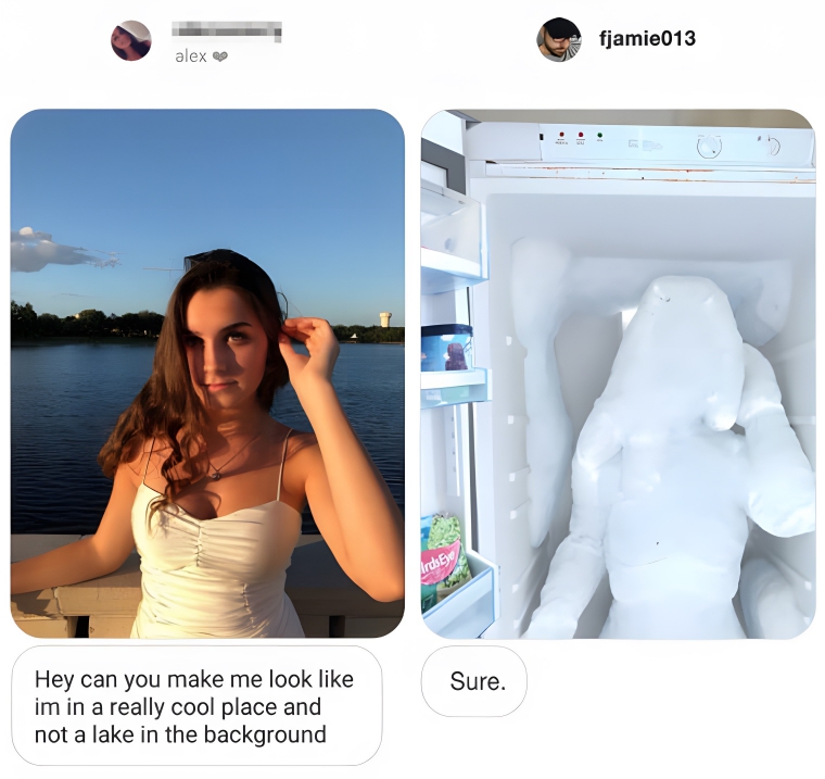 Be careful what you wish for, they always say. This girl asked that her background be changed to something “cooler”. A lake seems pretty cool to us, but we guess she had something else in mind. She ended up being photoshopped into one of the coolest places of all, a freezer. Is that what they call poetic justice? Or is it irony? Either way, the photo on the right is great.
