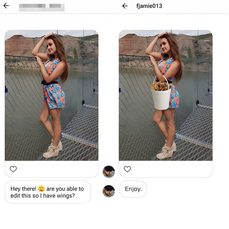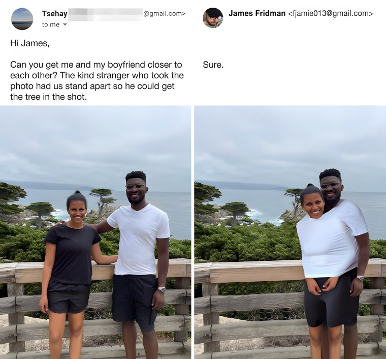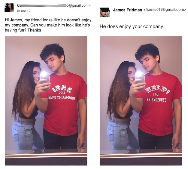 This one is so good that it’s actually kind of hard to spot the difference between these two photos at first. This girl thought that her friend didn’t look like he was enjoying their time together, so she asked that he be made to look like he was enjoying himself. This is probably the only one on the list that doesn’t get accurately fulfilled in some kind of way, but the change here is still hilarious.