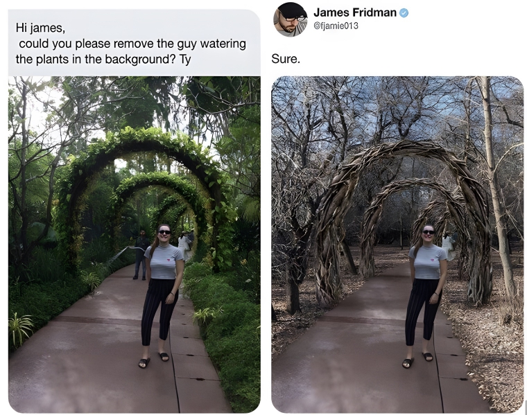 There’s a message somewhere in this photo, and if you look hard enough, you just might be able to spot it. There’s a guy watering plants in the background, and the girl in the photo wanted him removed. However, when you remove the guy watering plants, you’re inevitably going to get the photo on the right. Everything is dead, and honestly, it kind of reminds us of our gardens at home.