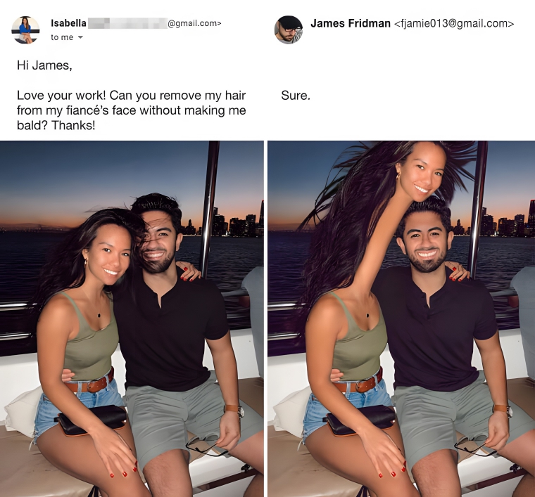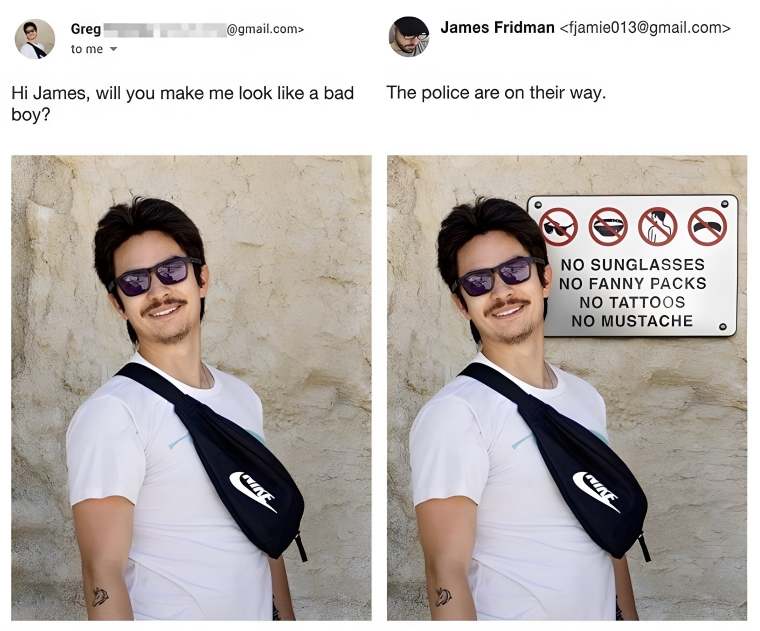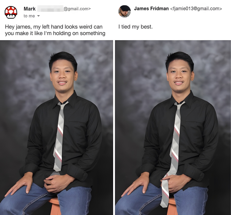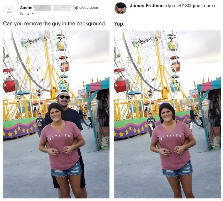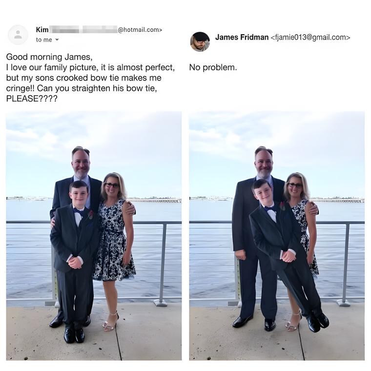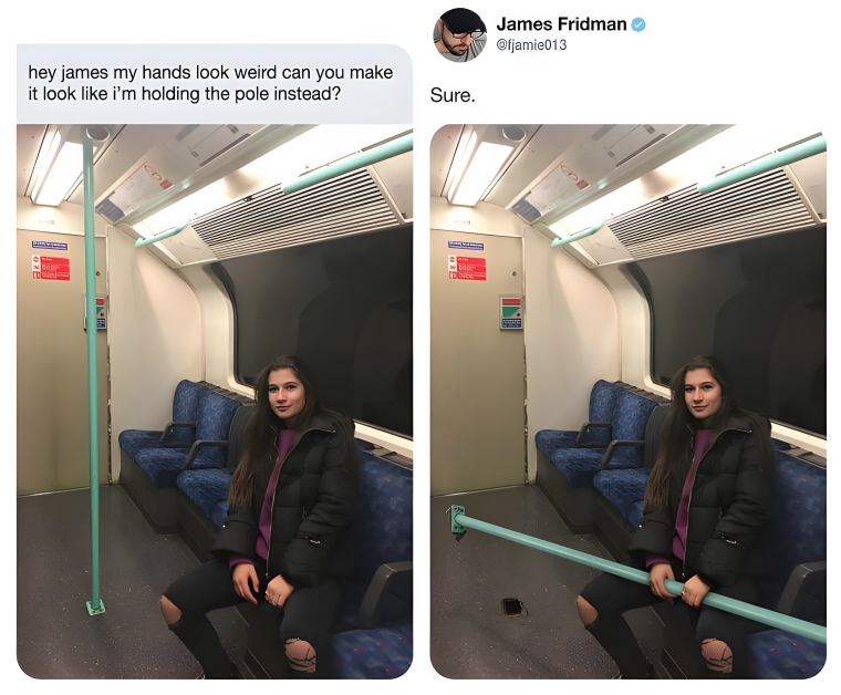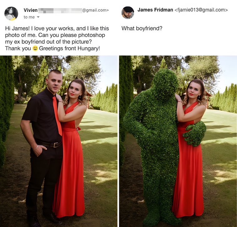 Meet James Fridman, the Photoshop whiz who keeps the online world on its toes. Hailing from Britain, this graphic designer has a knack for turning photo requests into hilarious masterpieces, all while adding his own playful twist. He’s been doing it for years and has kept one simple lesson: be careful what you ask for. Whether you want his help with photoshopping someone out of a photo or changing a background, he’ll surely surprise and exceed expectations. So gear up as we unveil the funniest photo edits.