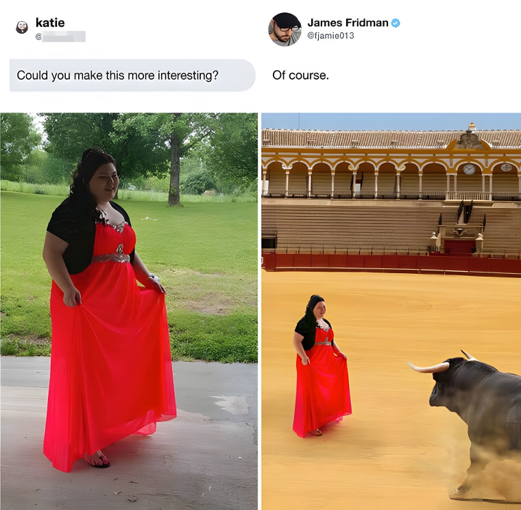 We thought the first photo on the left was pretty interesting, but the girl in the photo asked for her image to be spiced up a bit. So, the artist who edited it added a bullfighting ring and a bull to the image. What’s more interesting than a bullfighter? Just about nothing. The dress already being red also helps; you really almost fear for this girl’s life in the second image.