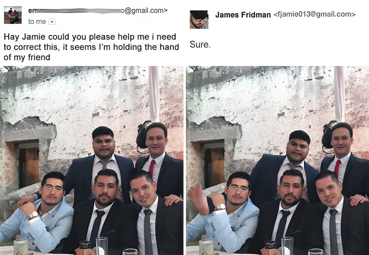 This guy was going back over the photo of him and his friends when he noticed that it looked like he and his friend were holding hands. And he’s not wrong; it does actually look like he and his friend are holding hands. So, he wanted it changed. However, they look even closer in the second photo. Only real friends let other friends prop their feet up on their shoulders.