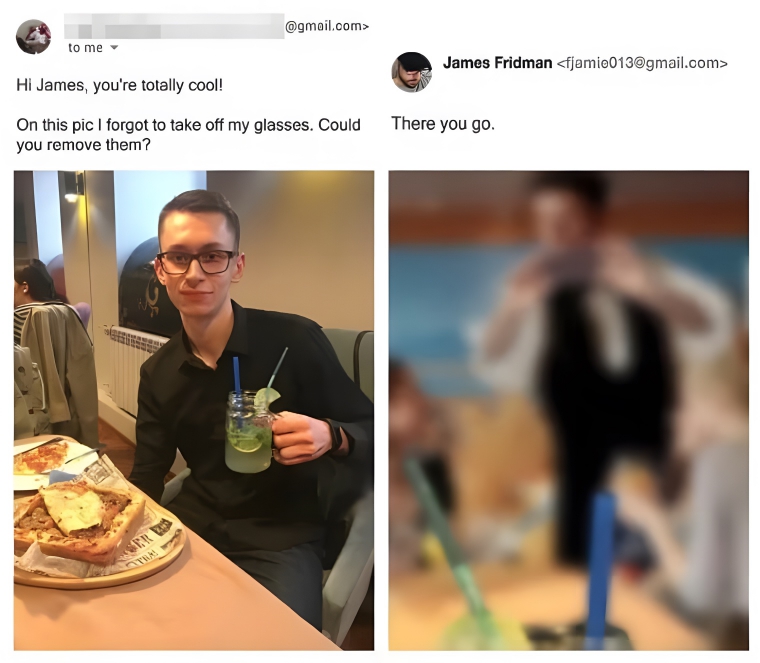 We absolutely love this edit. The guy in the photo on the right asked, “On this pic I forgot to take off my glasses. Could you remove them?” And as you can see (or can’t see), in the photo on the right, the picture was just made to look like it was from the perspective of someone who wore really thick glasses. We’re not even sure why this kid wanted to have his glasses removed in the first place, though.