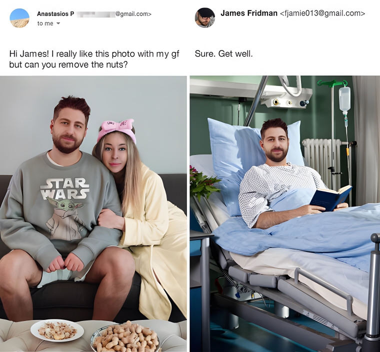 The guy in this photo sent in a request, asking that the nuts in the photo on the left be removed. We’re not really sure why since the whole photo looks a little off and the two of them look like they just woke up anyway. But he got his wish and ended up post-surgery in the photo on the right. We can only guess at what kind of surgery he was actually meant to be recovering from.