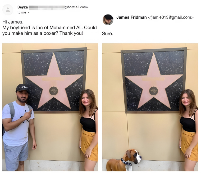 The guy in the photo on the left is a really big fan of Muhammid Ali, and he and his girlfriend went to see his star at the Hollywood Walk of Fame. So, his girlfriend wanted to do something nice and asked if he could be made into a boxer. We’re sure she wasn’t talking about the dog here, but the photo on the right technically isn’t entirely wrong.