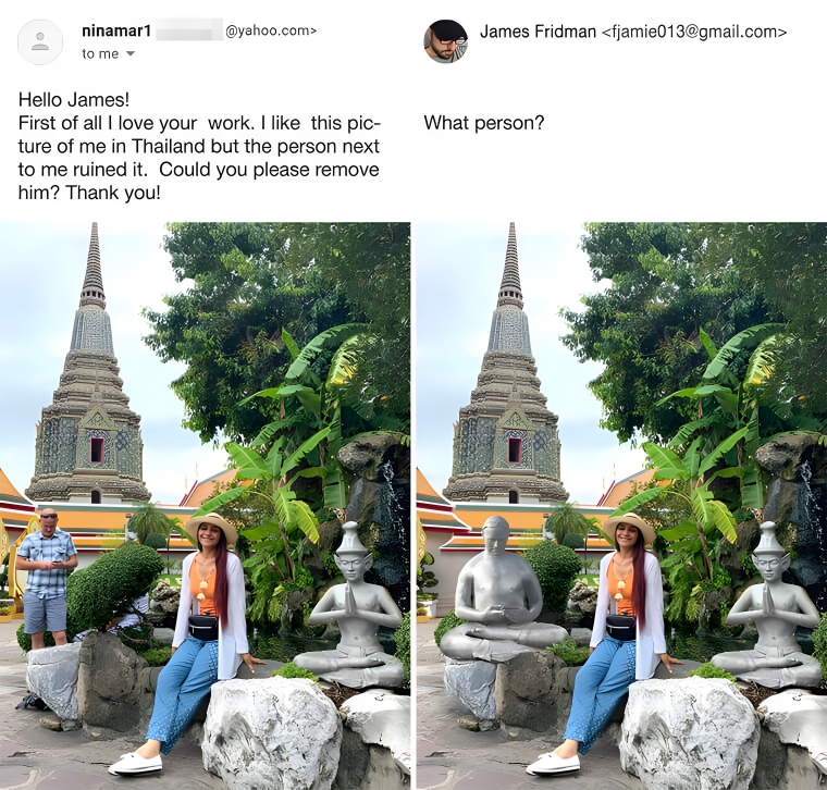 Isn’t it just really annoying when some random person ends up ruining a photo you really like? This girl thought so and asked for the guy in the background on his phone to be removed. He was replaced with a stone statue to match the one on the right, but he’s still peering down at his phone. He must’ve been looking at something really interesting for it to completely turn him to stone like that.