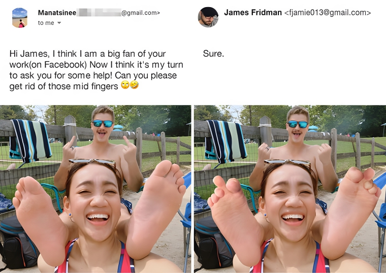 This one is probably pretty obvious, but the girl in this photo asked to have the guy’s two middle fingers removed. We can imagine why you might want something like that removed from a photo. However, they just ended up being replaced by the guy’s index toes. Still, they’re his index toes, and not his middle toes, which we suppose is much better than the pose he was doing before.