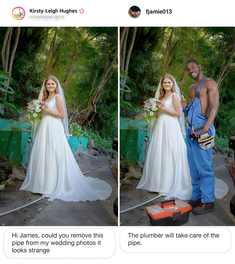 For some reason, this bride-to-be had her photos taken at the edge of a construction site. There’s a strange green wall and a weird pipe running across the ground. She asked for the pipe to be removed since it looked so out of place. Instead of removing the pipe, the guy who edited this image just added in a plumber to make the pipe look more “natural.”