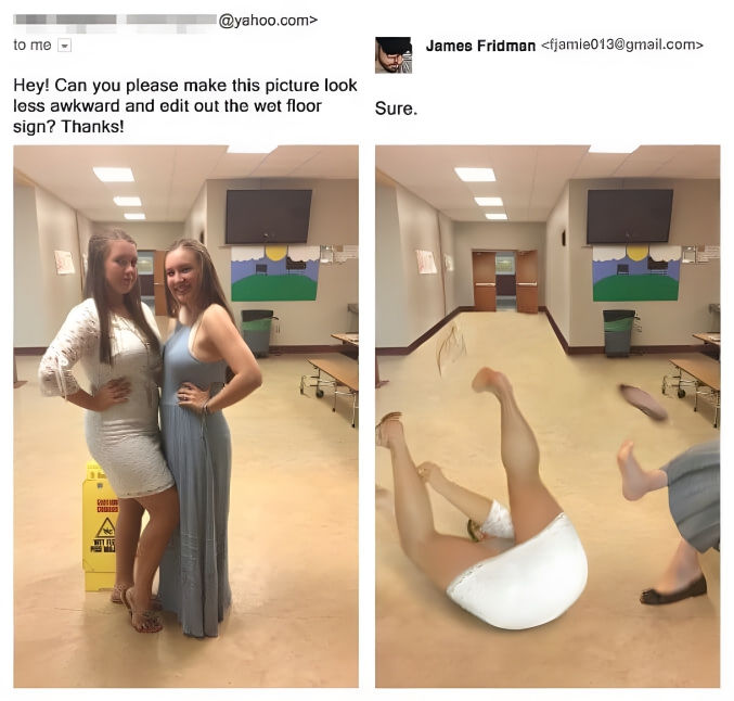 We get it. Nobody wants a wet floor sign in their photo. But why not just take the photo somewhere else? That sign was there for a reason, and who knows what might happen if you get rid of it. Apparently, you get the photo on the right. After the sign was removed, both girls were arranged so that it looked like they had tripped and fallen pretty badly.
