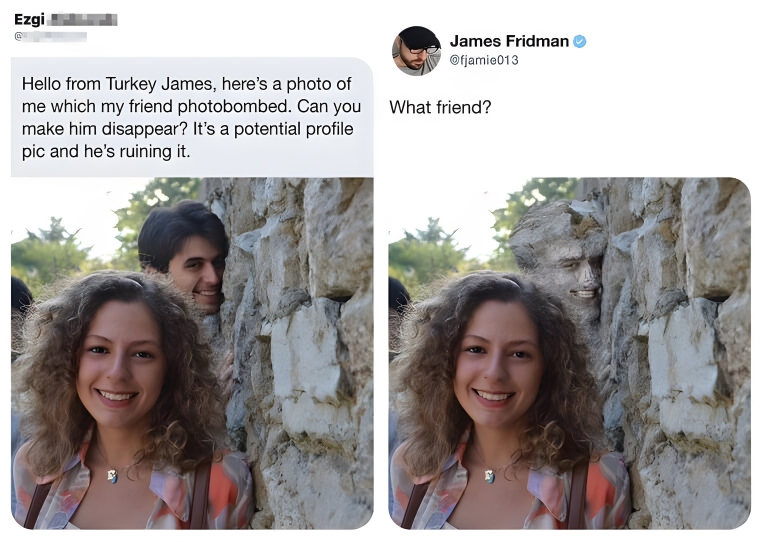 We all have that one friend who just turns up out of nowhere and photobombs a potentially great pic. This girl said that she wanted to use this photo as a profile pic, so she asked that her friend be removed from the background. Instead, he was just blended into the stone wall, and it’s actually slightly disturbing once you see it. Still, she should totally still use this as a profile pic.