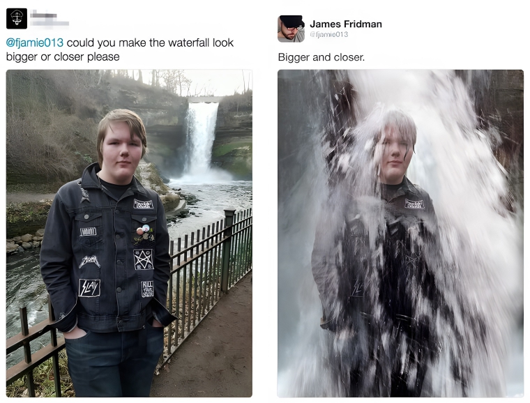 One of the hardest things about taking photos in nature or at attractions is making the object you went there to see stand out while also getting yourself in the picture. The waterfall in this photo was really far away in the background, or that’s what this kid thought, so he asked for it to be moved closer or made bigger. He got his wish and the waterfall was moved closer to him.
