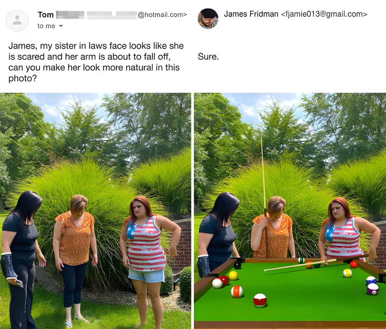 Candid photos can be great sometimes, but most of the time, people are just doing things that look a little bit awkward when captured in a still. This woman’s sister-in-law happened to be moving her arm when this photo was captured, and it turned out a little funny looking. She asked that something be done about her sister in laws arm to make it look more natural. But, as you can see, the only way to make that look more natural was by adding a pool stick and table.