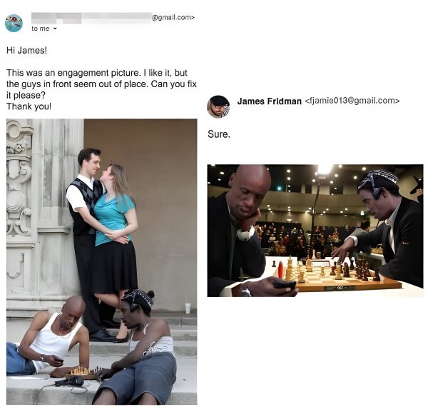 This couple had engagement photos taken, and their photographer apparently posed them right in front of two guys playing a game of chess. The bride asked that the two guys be taken out as they looked out of place, but to be fair, they were probably there first. So, they were taken out of the photo on the left and put in an auditorium for what looks like a chess championship.