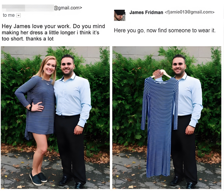 It’s usually not a good idea to comment negatively about someone’s clothes, even if it’s a really small comment. This guy asked that the girl’s dress be shortened because he thought it looked too long. However, he got more (or less) than he bargained for in the second photo. The dress was extended, but he lost the girl. Now, we’re not sure if that was his girlfriend but even so.